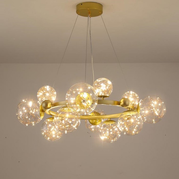 S designovým konceptem luxusní estetiky spojuje lustr Starry Ball nápadité nápady s dostupnými materiály a vytváří praktický, ale luxusní lustr. Je to pocta přírodě a umožňuje nám užívat si tento krásný přírodní úkaz-hvězdy doma. Je vyroben z kovu a skla a skládá se ze zlatého kulatého těla lampy připevněného čirými skleněnými koulemi. Uvnitř kuliček jsou LED záblesková světla. Je k dispozici ve dvou velikostech, 6 a 12 hlav. Tento hvězdný design přináší krásu postmoderního umění, které je elegantní. Tento ohromující lustr je kreativní molekulární světlo, které jistě upoutá a zapůsobí na vaše hosty, pokud je zavěšeno v obývacím pokoji. Večer vás doprovázejí hvězdy a bude to romantické překvapení.