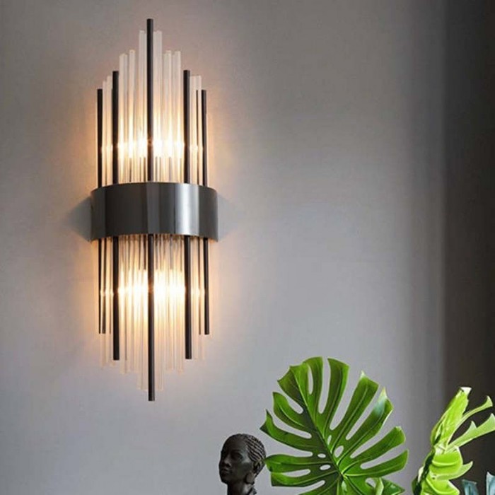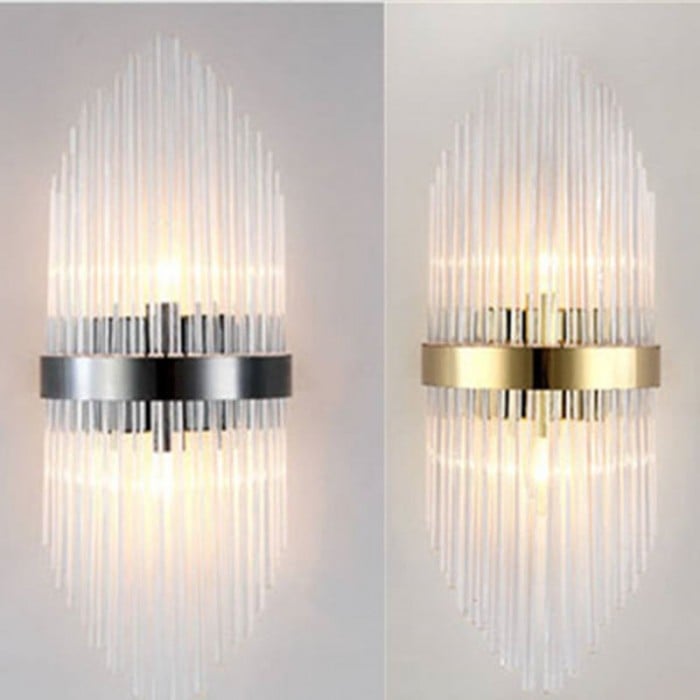 Die moderne Luxus-Kristall-Wandleuchte ist eine schöne Dekoration mit modernem Design, die Ihr Zuhause oder Ihre gewerblichen Bereiche verschönert, um es schöner und eleganter zu machen. Es wird ein prächtiges Interieur wie ein palastähnlicher Ort schaffen. Die Kristall-Wandleuchte besteht aus einem Bündel transparenter Kristallstäbe mit einer schwarzen oder goldenen Krawatte in der Mitte. Aus hochwertigem Kristall gefertigt, ist es langlebig und leicht zu reinigen. Darüber hinaus hat es durch Galvanisieren eine bessere Farbechtheit mit weniger Ausbleichen als herkömmliche Lampen und verfärbt sich nicht. Der zarte Schliff enthüllt den glänzenden Glanz von Kristall, um die elegante Wirkung zu erzielen und Ihren edlen Geschmack exquisit zu unterstreichen. All diese Eigenschaften vereinen sich zu vier eleganten Modellen mit einem so niedrigen Preis! Es kann auch in der Inneneinrichtung Ihrer Villa oder Ihres Hotels verwendet werden!