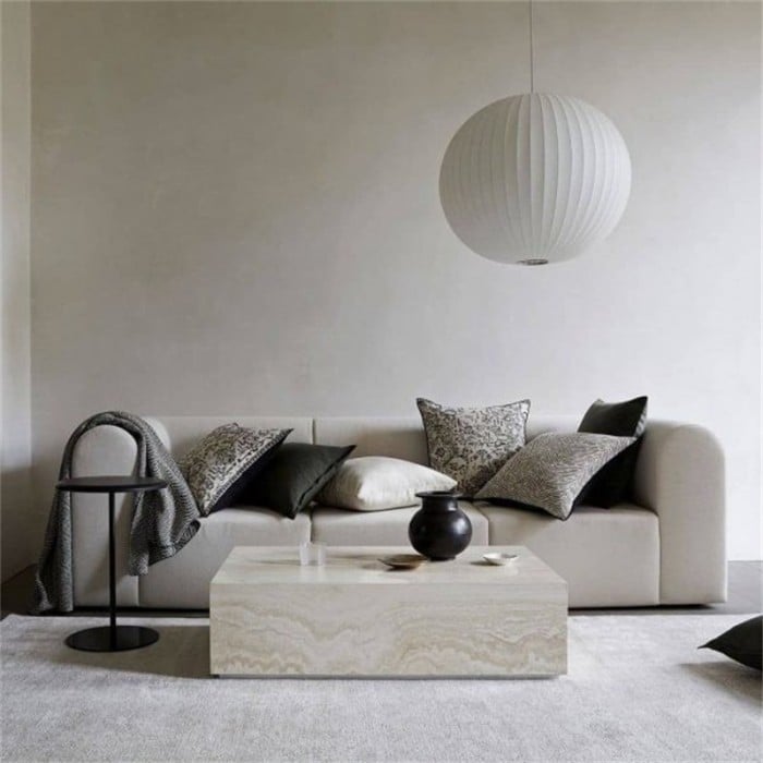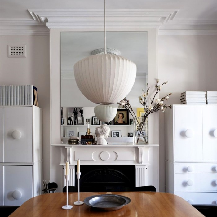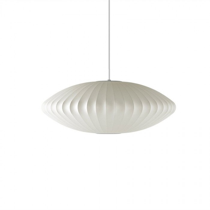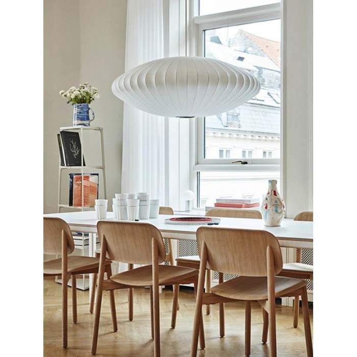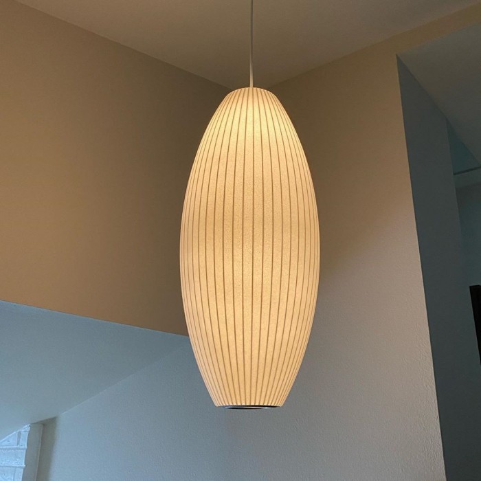 Die Nelson Bubble Lampe wird durch das Stahlgerüst geformt und mit Seide bedeckt, die wie ein voller Kokon aussieht. Wenn es beleuchtet wird, erzeugen die Stähle ein entzückendes geometrisches Muster durch den halbdurchscheinenden Schirm.