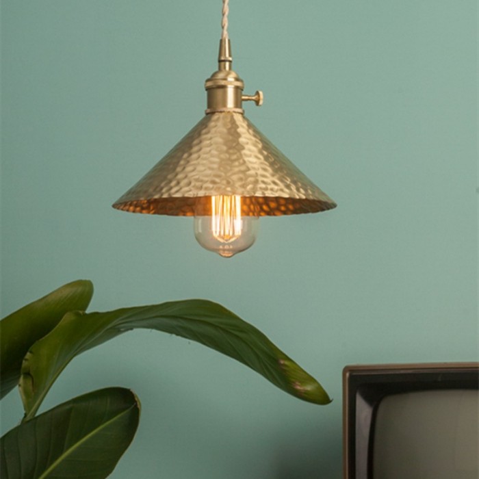 La lámpara colgante moderna VEVIXA, con pantalla cónica, es dorada en su totalidad, lo que hace pensar en un montón de granos cosechados. Está disponible en dos acabados, uno con una ondulación de puntos y otro con una ondulación lisa.