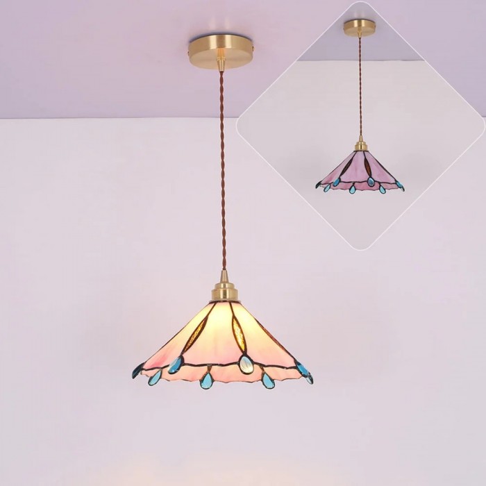 先細りのシルエットと 6 つの魅惑的な色合いを備えたこのティファニー ペンダント ライトは、レトロな魅力を醸し出します。繊細なステンドグラスのパネルは、優美な光を捉えて屈折させるよう細心の注意を払って作られており、あらゆる空間に洗練さと魅力を加えます。