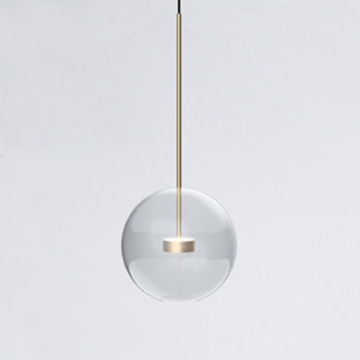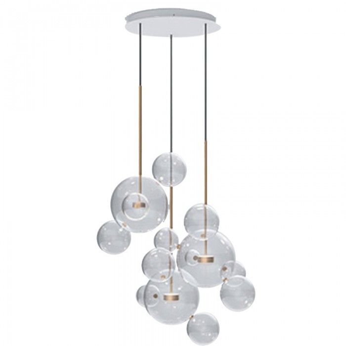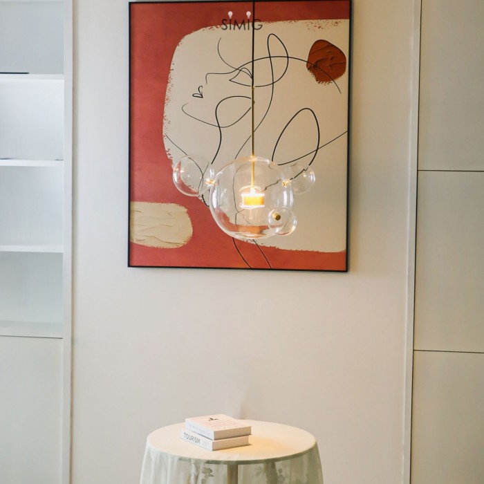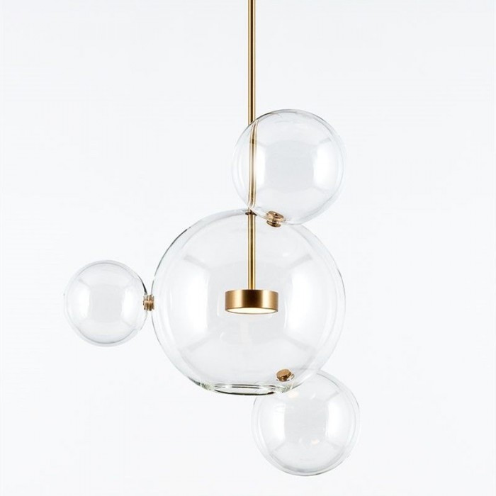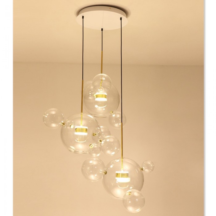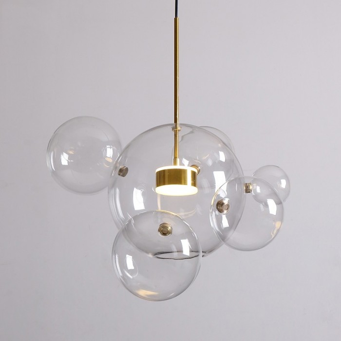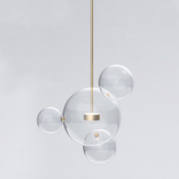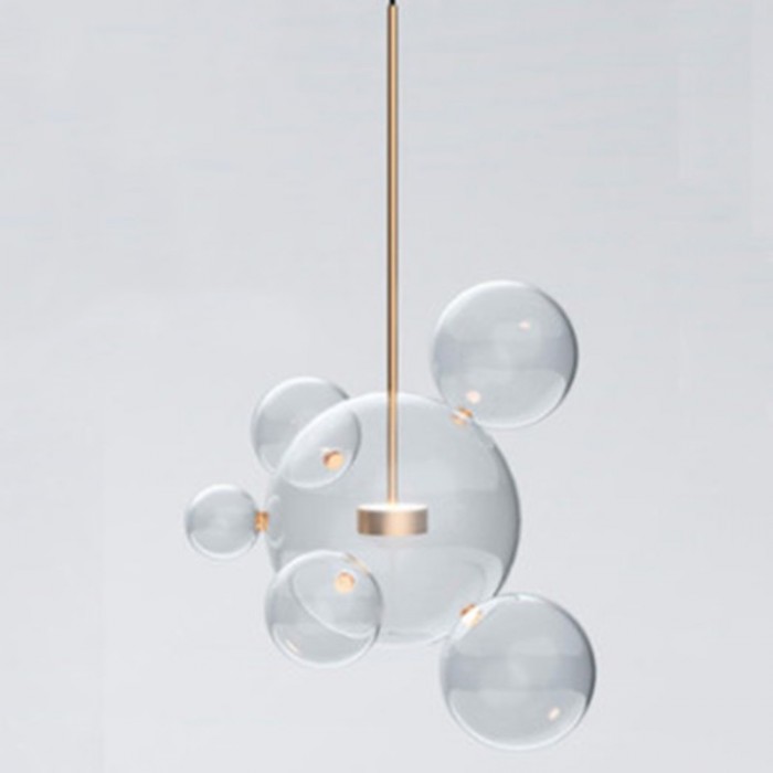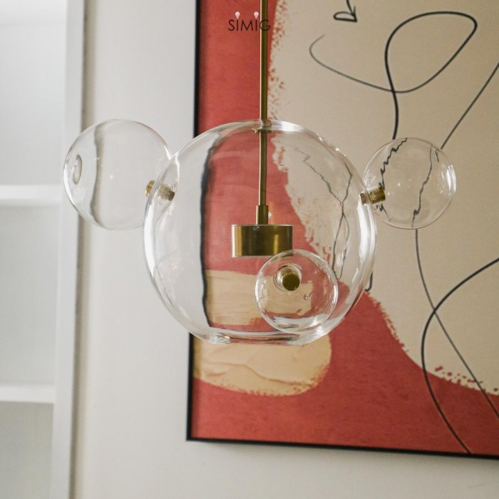 Het centrum van de bubble lamp is een glazen bol met een open onderkant die een warme LED-lichtbron draagt. En er zijn verschillende kleinere complete glazen bollen aan bevestigd. De metalen staaf is goudkleurig, wat bijdraagt aan het versterken van de glans van het warme licht.