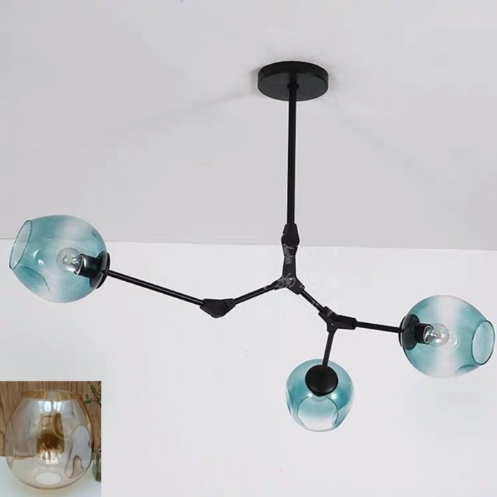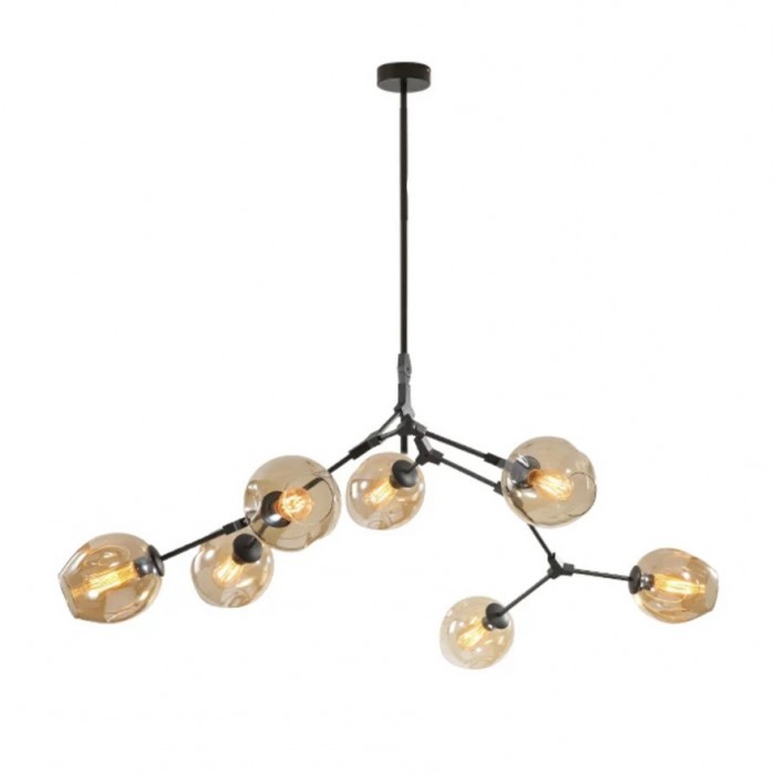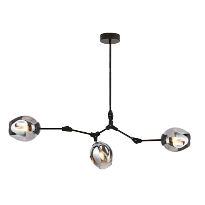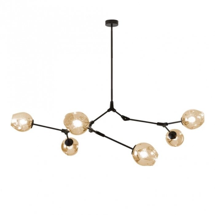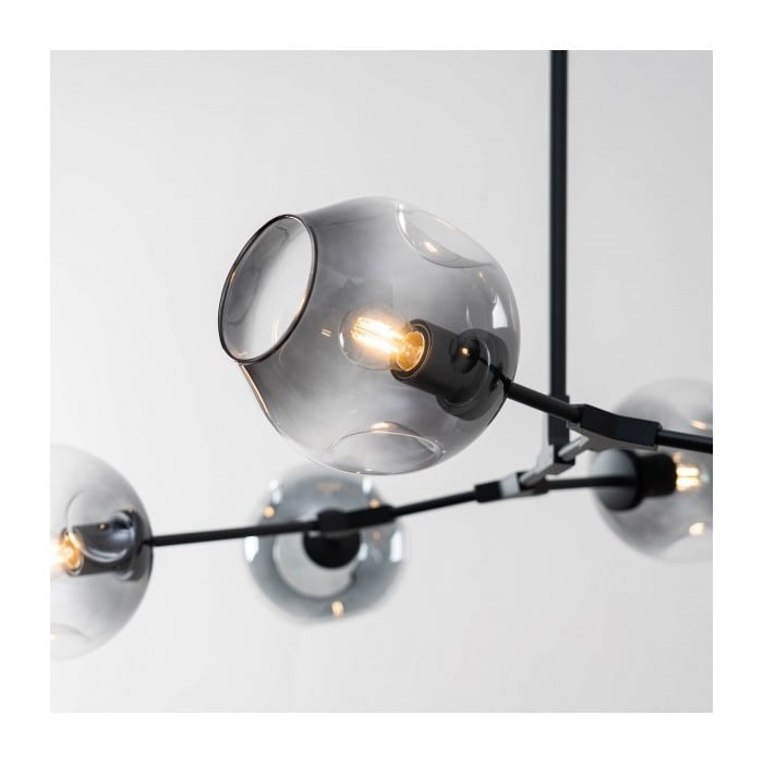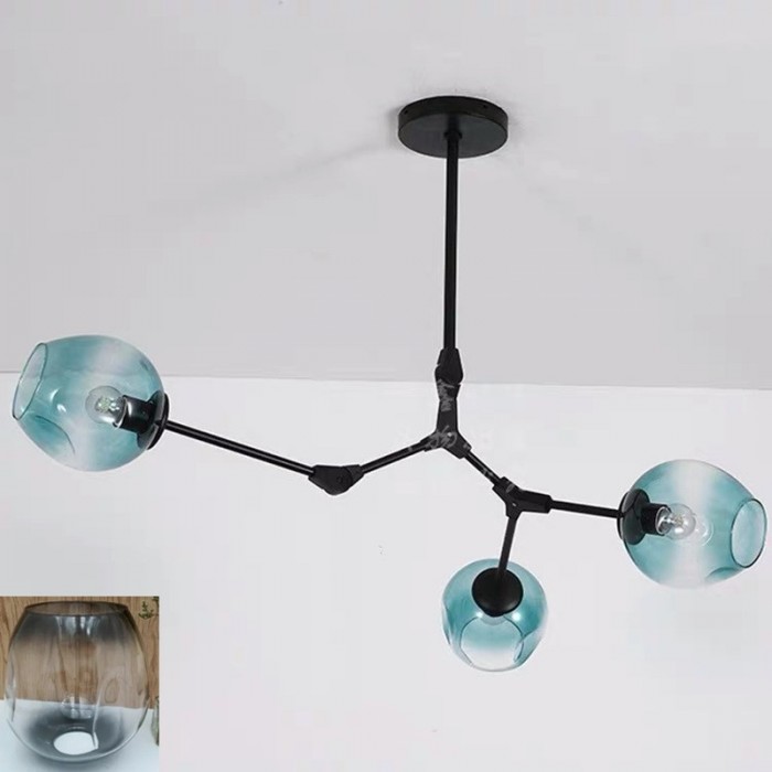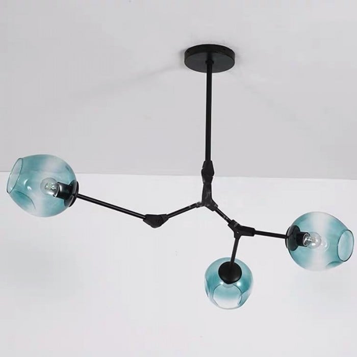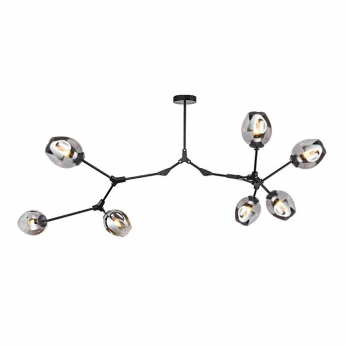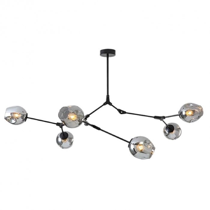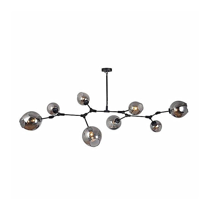Żyrandol Lindsey Adelman Branching Bubble ma estetyczną strukturę molekularną złożoną z prętów i nieregularnych kloszy z regulowanymi przegubami. Może się rozciągnąć, aby dopasować się do przestrzeni lub pozostać w centrum. Sześć kolorów szkła i dwa kolory metaliczne można dowolnie łączyć.