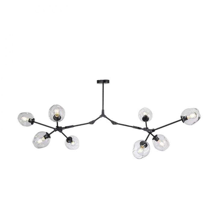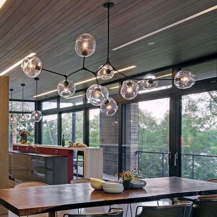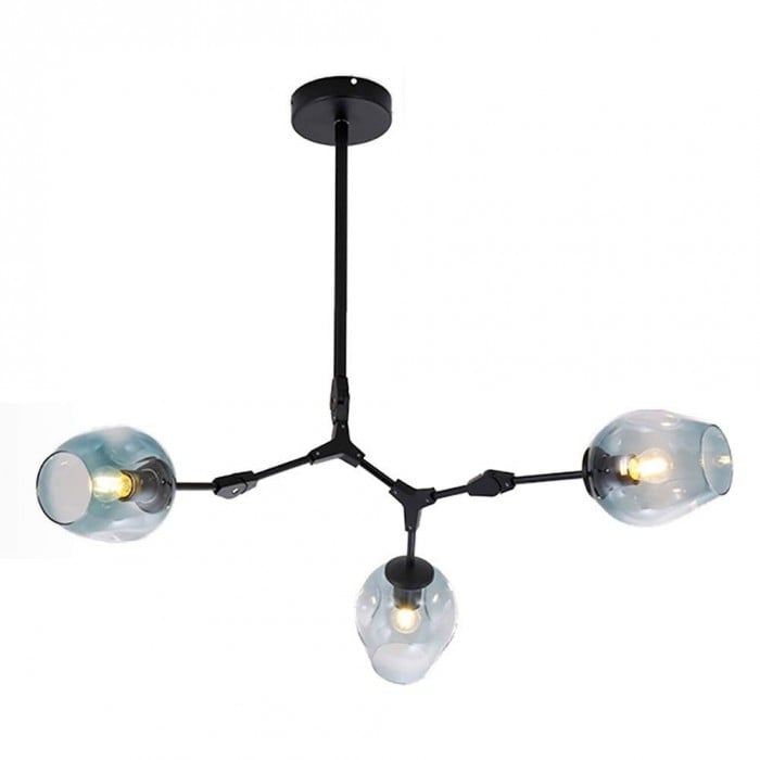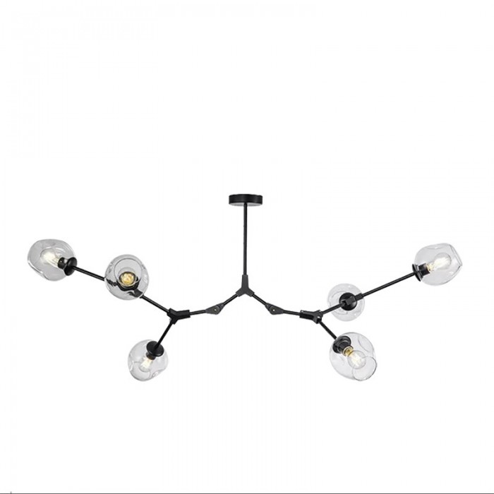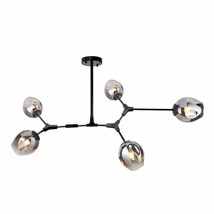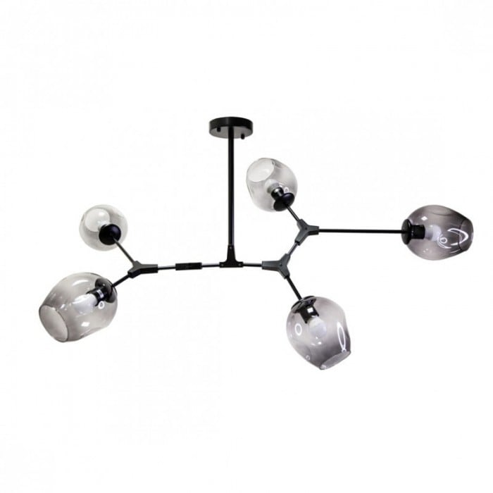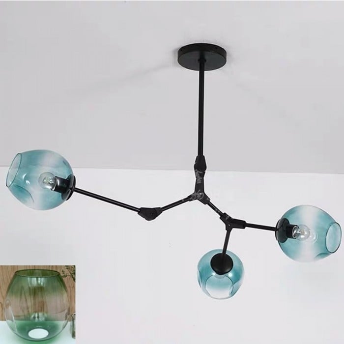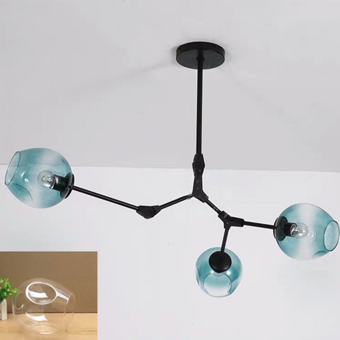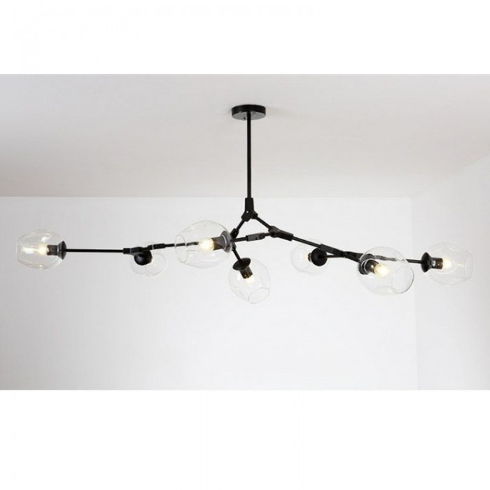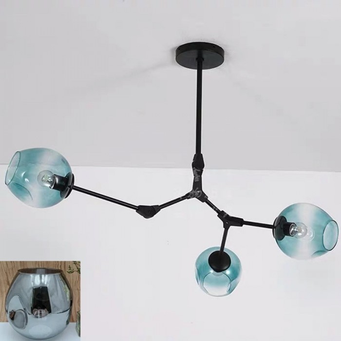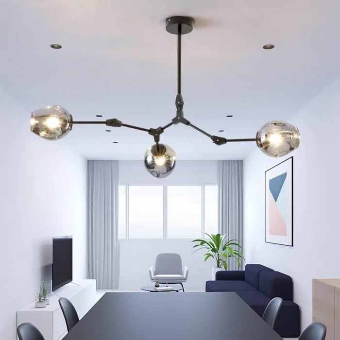 Żyrandol Lindsey Adelman Branching Bubble ma estetyczną strukturę molekularną złożoną z prętów i nieregularnych kloszy z regulowanymi przegubami. Może się rozciągnąć, aby dopasować się do przestrzeni lub pozostać w centrum. Sześć kolorów szkła i dwa kolory metaliczne można dowolnie łączyć.