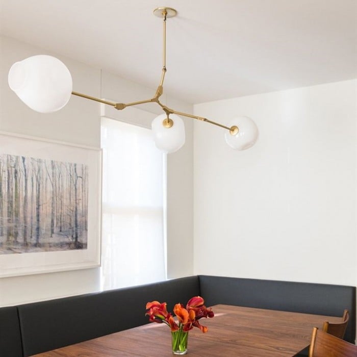 Ten efektowny żyrandol Lindsey Adelman Branching Bubble idealnie nadaje się do zawieszenia nad długimi stołami lub miejscami do siedzenia. Minimalistyczna liniowa struktura sprawia, że z łatwością wkomponuje się w każdą nowoczesną dekorację wnętrz.