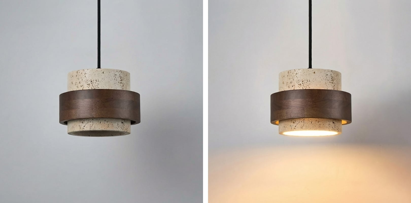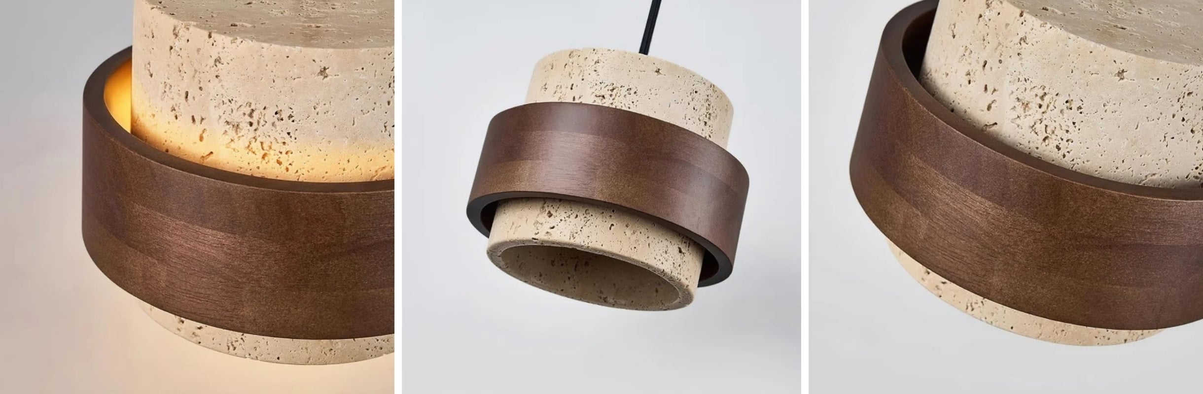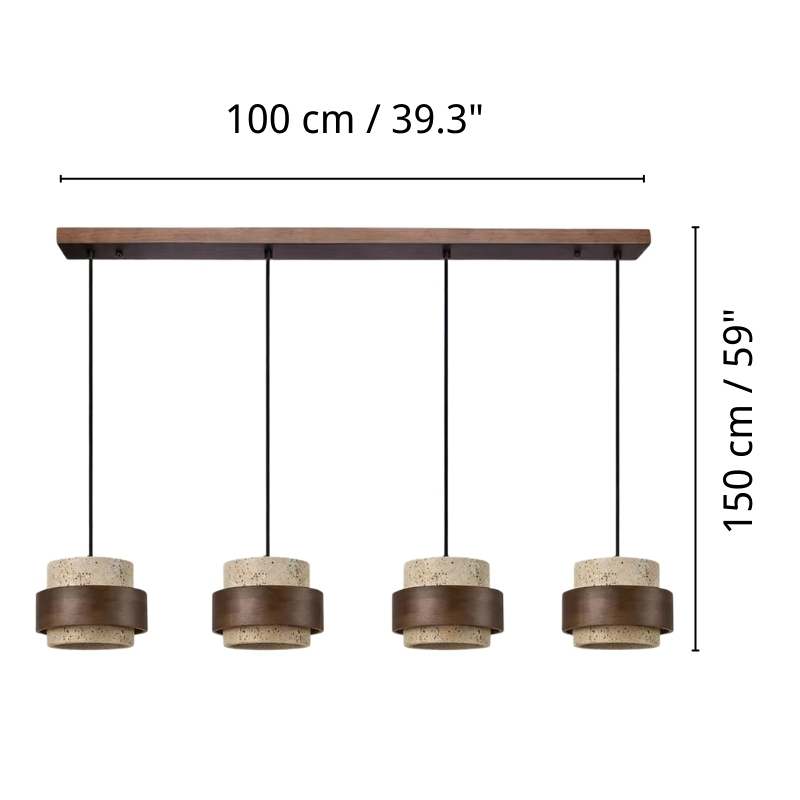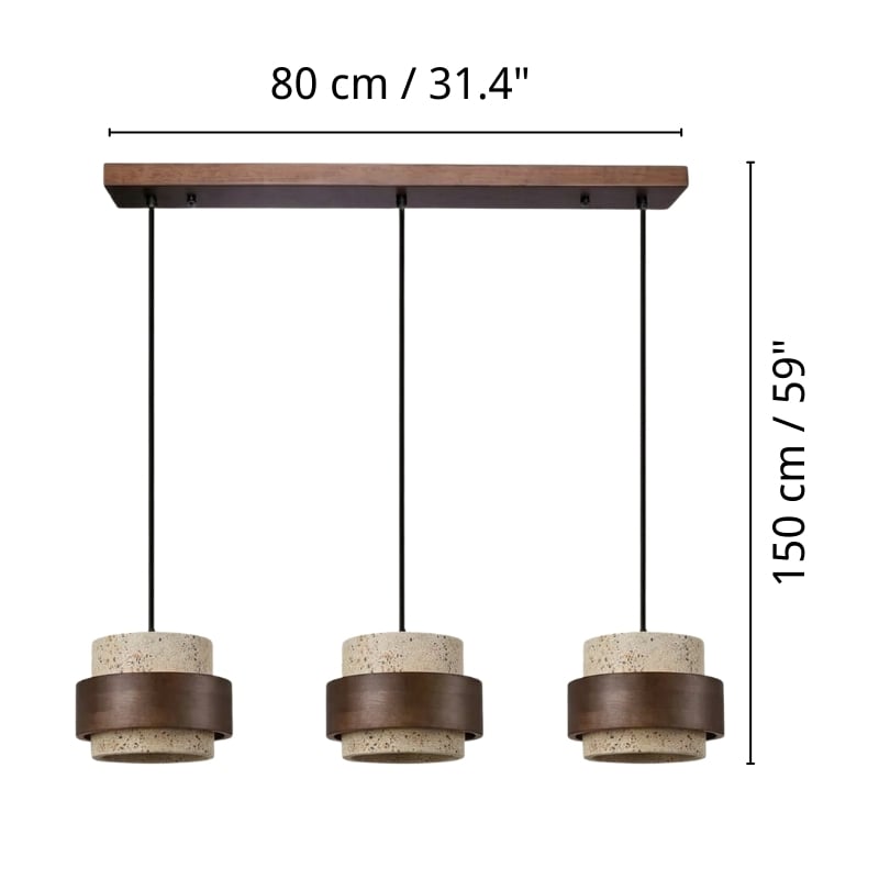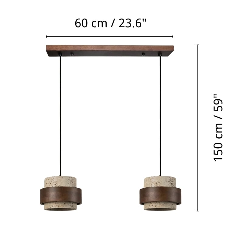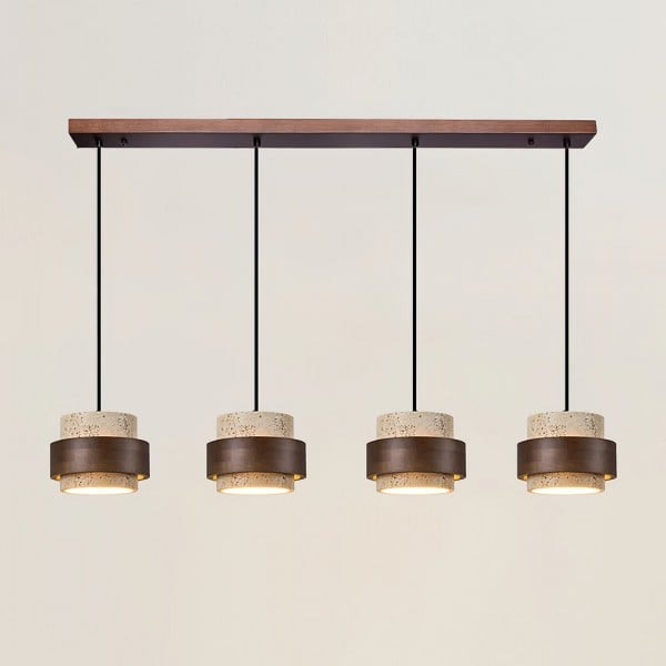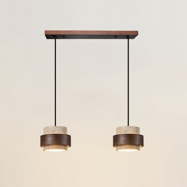 The travertine and natural stone pendant light provides elegant lighting for the kitchen, bedroom, or living room. It is available in cylindrical drum or beige double cylinder models, offering refined and modern designs. Also perfect as a 3-light walnut and natural wood pendant light, or a travertine and wood pendant light, it blends harmoniously into the most sophisticated interiors. Combining natural materials with contemporary elegance, the walnut and travertine pendant light creates a warm and timeless atmosphere.