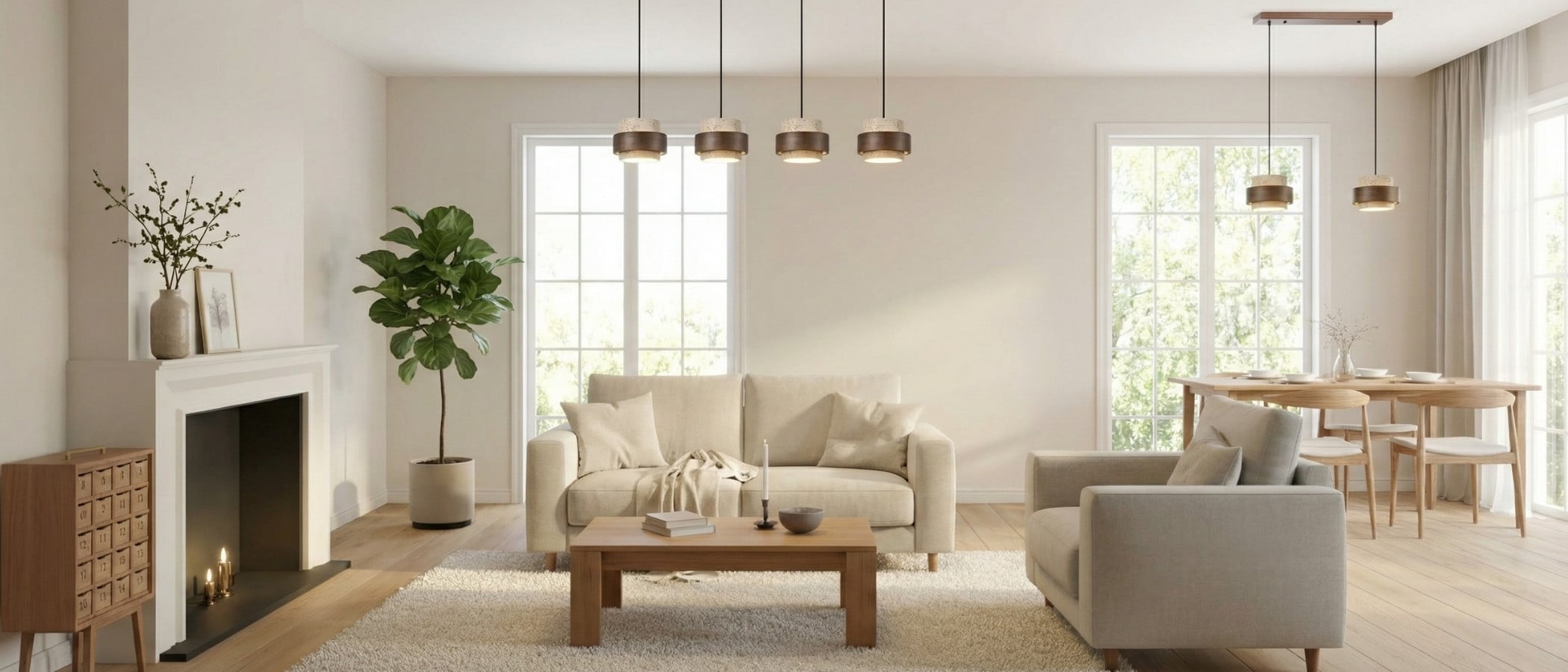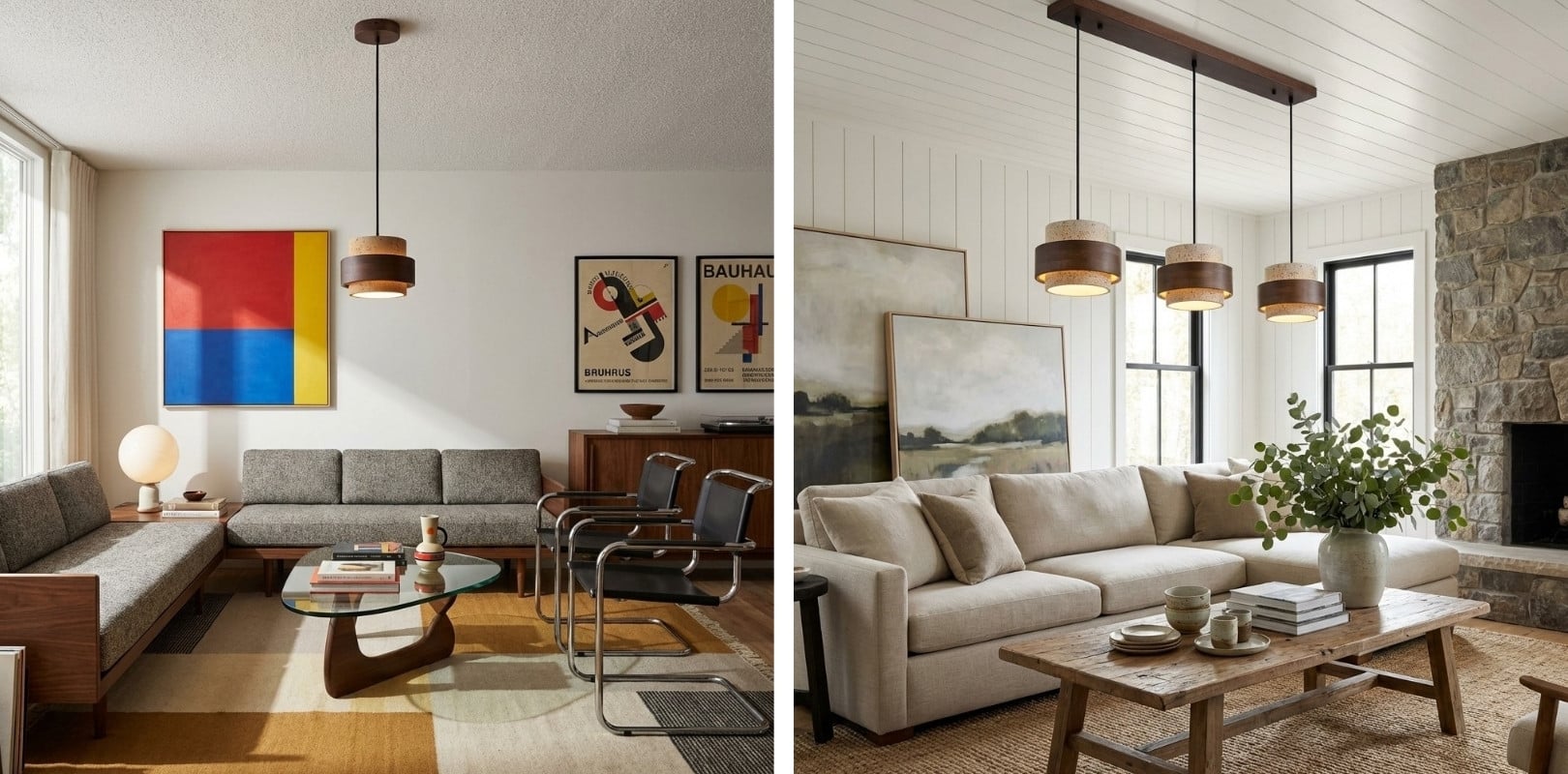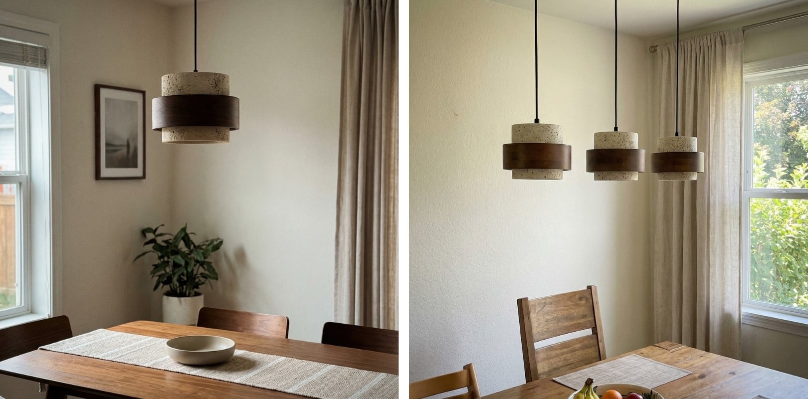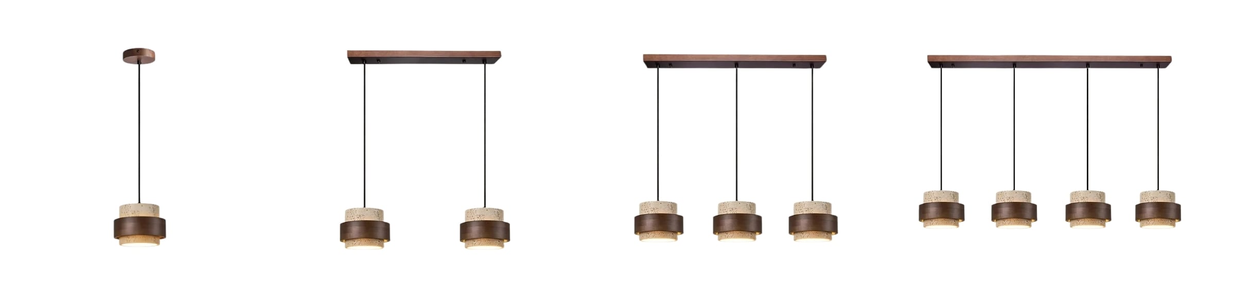 The travertine and natural stone pendant light provides elegant lighting for the kitchen, bedroom, or living room. It is available in cylindrical drum or beige double cylinder models, offering refined and modern designs. Also perfect as a 3-light walnut and natural wood pendant light, or a travertine and wood pendant light, it blends harmoniously into the most sophisticated interiors. Combining natural materials with contemporary elegance, the walnut and travertine pendant light creates a warm and timeless atmosphere.