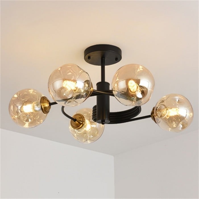 Globe Combination Pendant Lamp features a circular body attached by glass balls like a tornado. With amber or smoky gray glass, the graceful color scheme make it eye-catching in any room. Available in two sizes and two finishes.