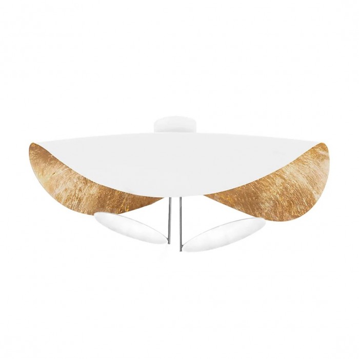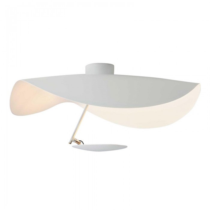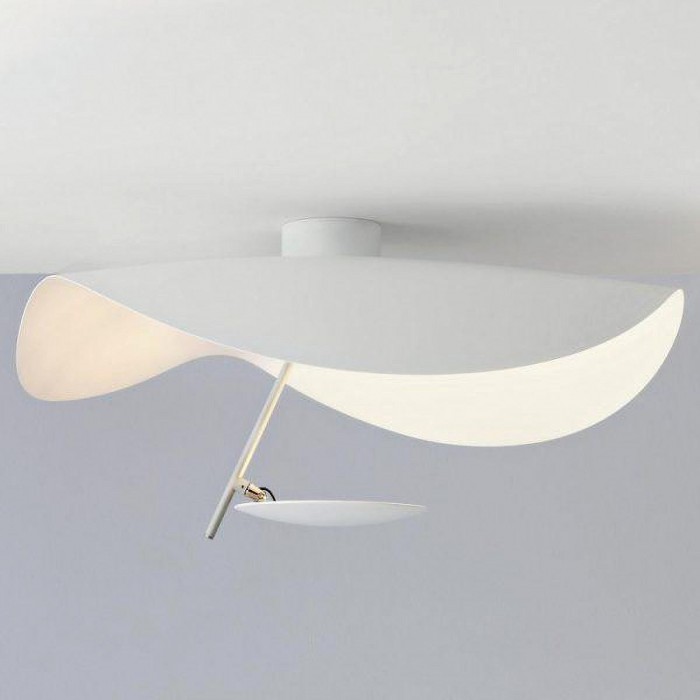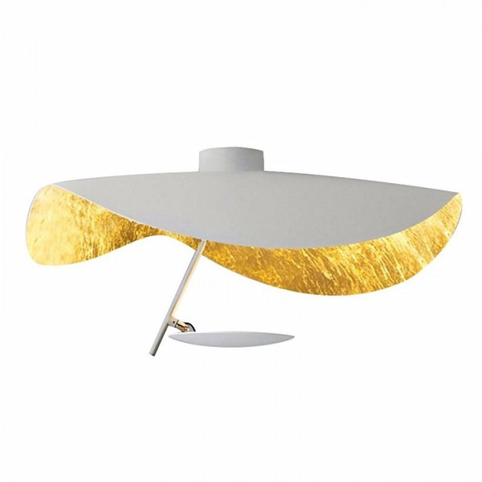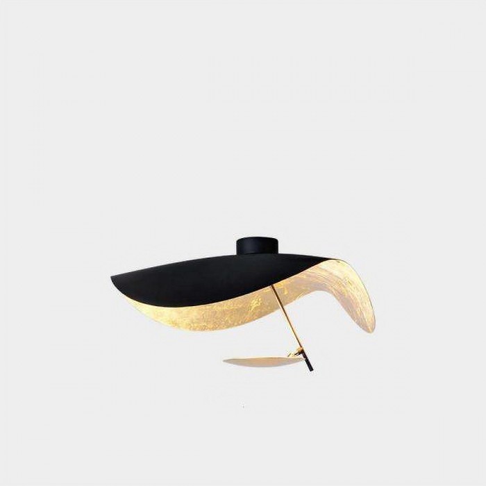 The large and undulating metal disc covers a flat small disc with LED light source. It is available in three color schemes, black exterior and gold interior, white exterior and gold or white interior.