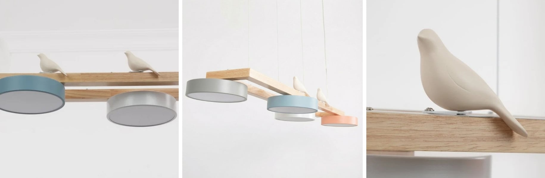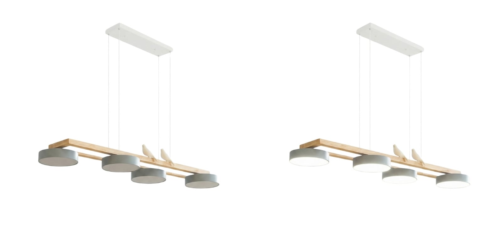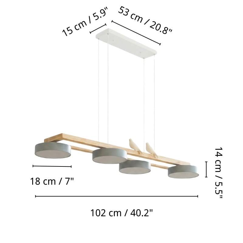 This New Style Fashion Bird Long Chandelier blends nature-inspired elements with modern design, featuring a wooden beam that elegantly supports three minimalist lampshades. The subtle addition of two delicate bird figurines perched atop the beam adds a serene, making it a perfect piece for spaces that seek to combine contemporary style with organic accents. Ideal for placement above a dining table or in a softly styled living room, this light fixture not only illuminates spaces but also serves as a focal point of artistic decor.
