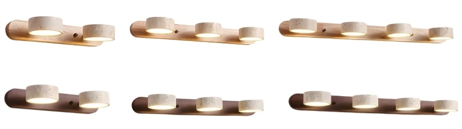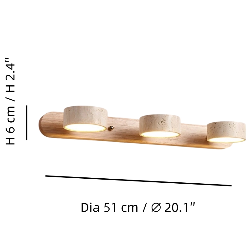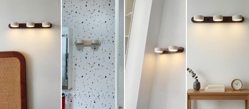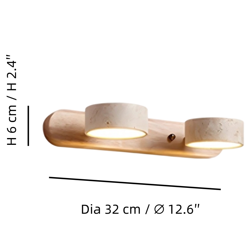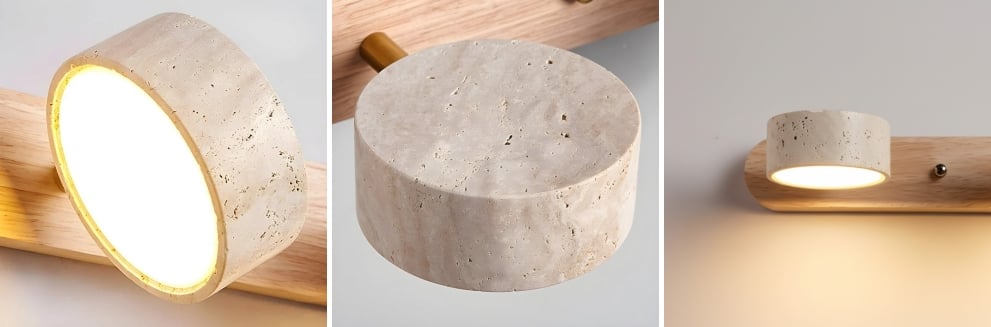 Double wall light in stone and vintage walnut for bathroom mirror and travertine wood wall light for living room provide elegant lighting for the bedroom, kitchen or toilet. The natural stone and travertine wood wall light models with vintage effect combine noble materials and Mediterranean, rustic or wabi-sabi design, creating a warm and refined ambiance suitable for all your spaces.